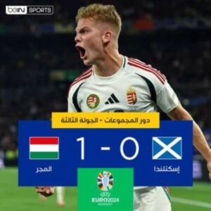 و في المباراة الثانية لحساب المجموعة نفسها، مساء أمس الأحد أيضاً، تمكّن المنتخب المجري من خطف فوز ثمين وقاتل من منتخب اسكتلندا في الوقت بدل الضائع، أحرزه كيفين كسوبوت، وبهذا الفوز أحيا منتخب المجر حظوظه بالتأهل إلى الدور الثاني ضمن أفضل المنتخبات الحائزة على المرتبة الثالثة في مجموعاتها، فيما ودع منتخب اسكتلندا البطولة.