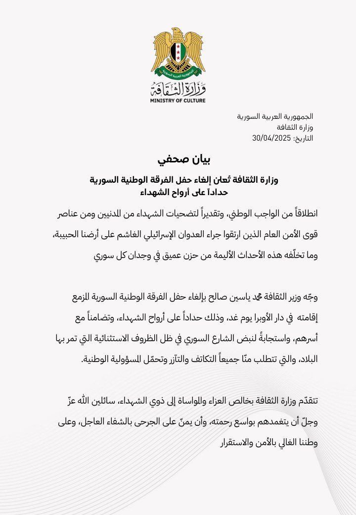 وأكدت وزارة الثقافة في بيان صحفي اليوم أن إلغاء الحفل ينطلق من الواجب الوطني، وتقديراً لتضحيات الشهداء من المدنيين وعناصر قوى الأمن العام الذين ارتقوا جراء العدوان الإسرائيلي الغاشم على أرضنا الحبيبة، وما خلفته تلك الأحداث من حزن عميق في وجدان كل سوري.