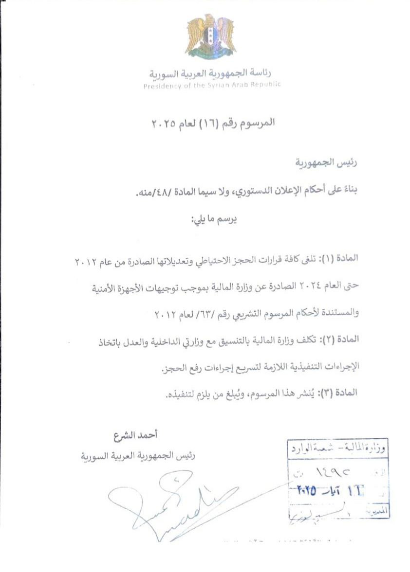 وأكد الوزير أن هذه الخطوة تعكس عزم الدولة السورية الجاد على إنهاء الحقبة السابقة التي شهدت الكثير من الإجراءات الظالمة، ورفع الظلم عن المتضررين، وإعادة تحريك عجلة النشاط الاقتصادي في البلاد.