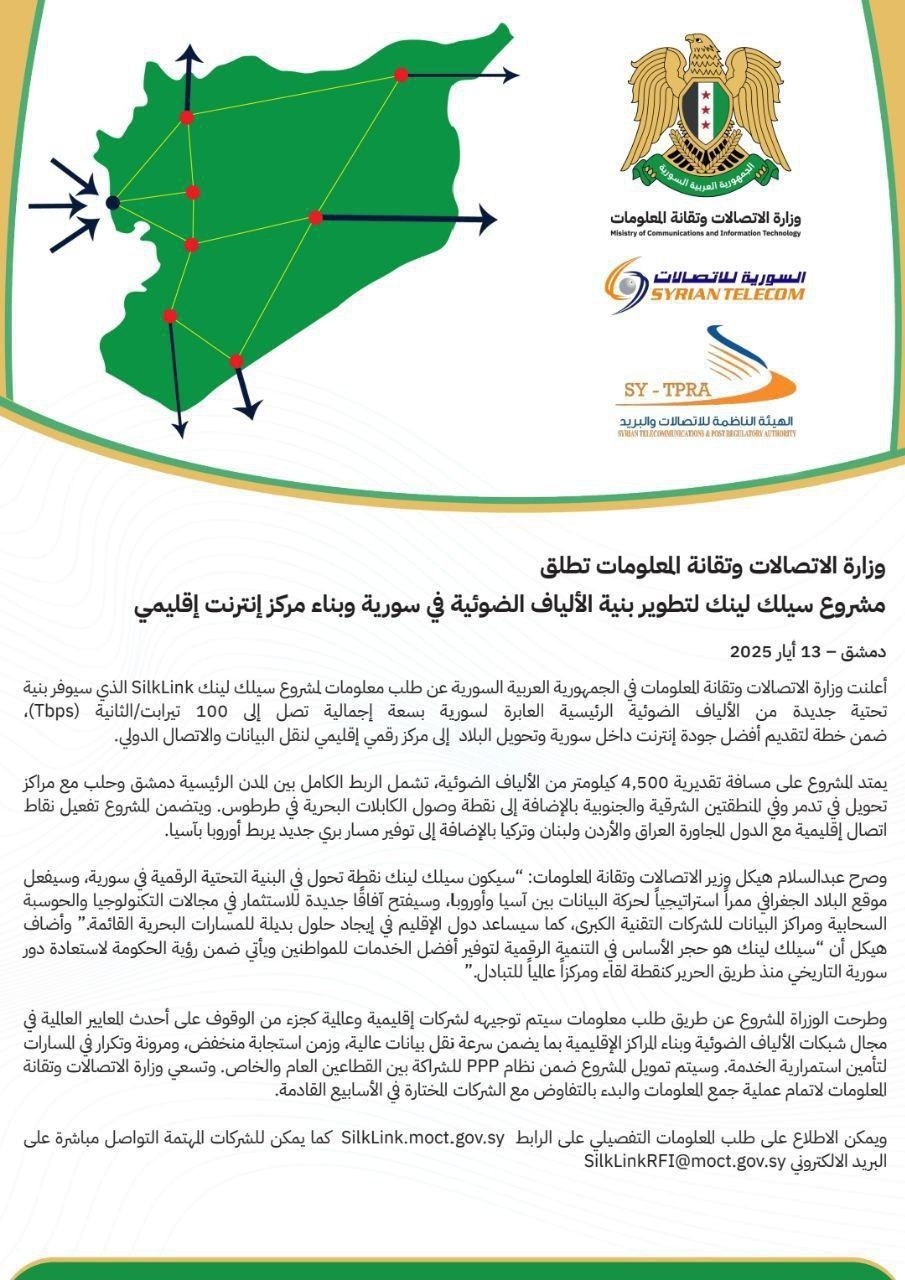 في خطوة استراتيجية لتحسين جودة الإنترنت ورفع كفاءة البنية التحتية الرقمية أعلنت وزارة الاتصالات وتقانة المعلومات في الجمهورية العربية السورية عن طلب معلومات لمشروع “سيلك لينك – SilkLink”، الذي يشكل بنية تحتية جديدة من شبكات الألياف الضوئية الرئيسية داخل سوريا، بسعة إجمالية تصل إلى 100 تيرابت/الثانية (Tbps)، ضمن خطة تهدف إلى تحسين جودة الإنترنت داخل سوريا وتحويل البلد إلى مركز إقليمي لنقل البيانات والاتصال الدولي.