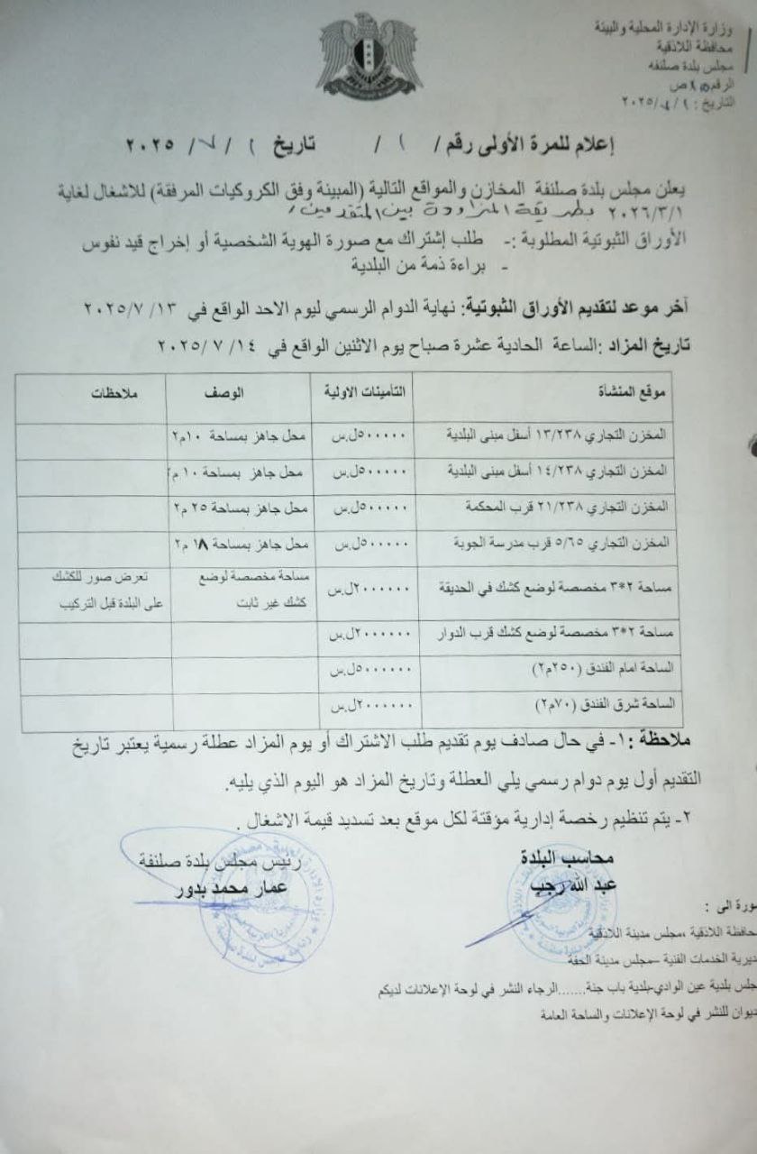 أعلن مجلس بلدة صلنفة عن مزايدة علنية لإشغال بعض المخازن والمواقع ، وذلك حتى تاريخ 1 آذار 2026. حيث يأتي هذا الإعلان بهدف اختيار أفضل العروض المقدمة من خلال طريقة المزايدة .