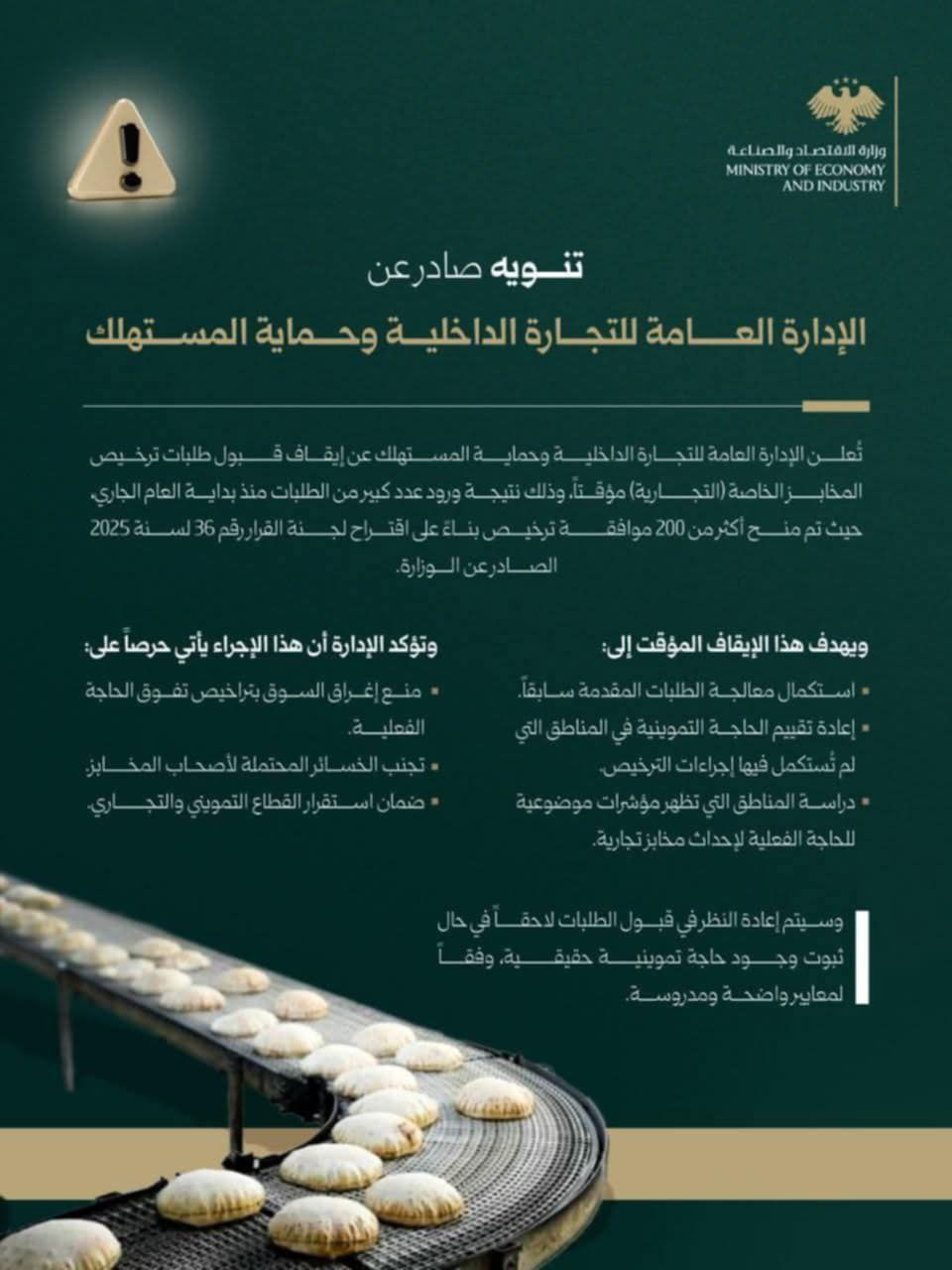 أعلنت وزارة الاقتصاد والصناعة – الإدارة العامة للتجارة الداخلية وحماية المستهلك، عن إيقاف مؤقت لاستقبال طلبات ترخيص المخابز الخاصة (التجارية).