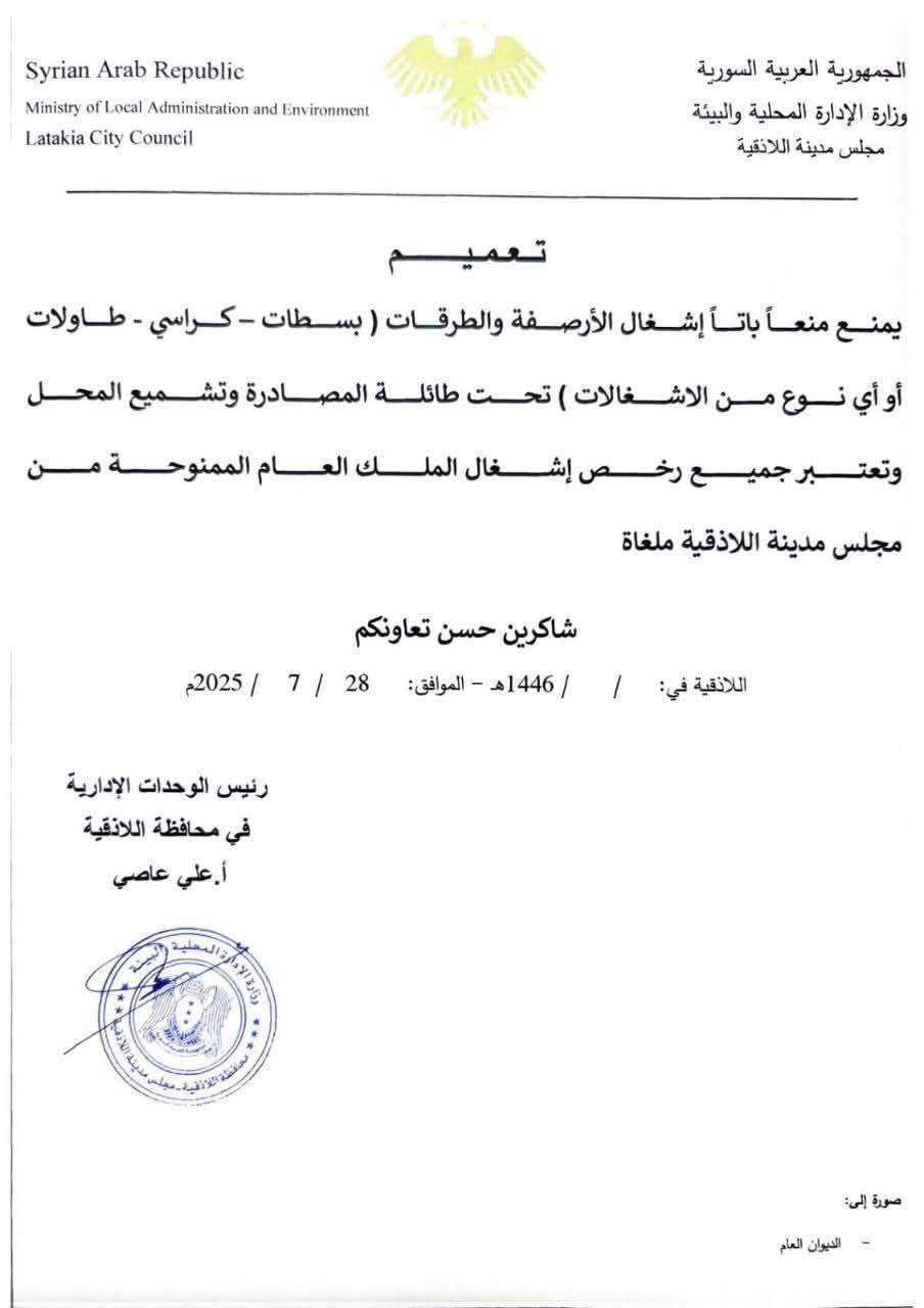 أصدر رئيس الوحدات الإدارية في محافظة اللاذقية السيد علي عاصي تعميماً صارماً يمنع أي إشغال على الأرصفة والطرقات.