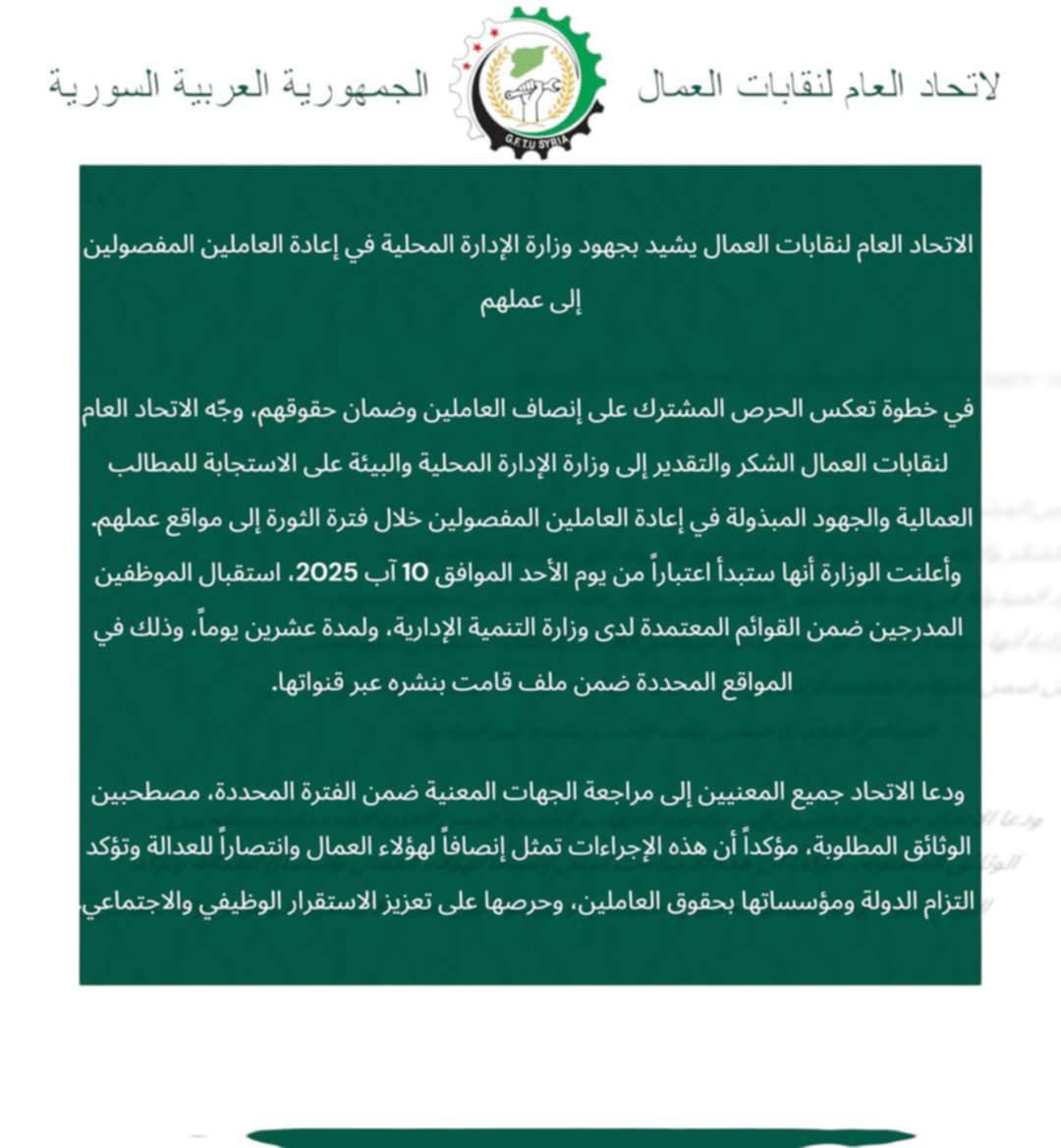وفي سياق متصل، دعا الاتحاد العام لنقابات العمال جميع المعنيين إلى مراجعة الجهات ذات الصلة خلال الفترة المحددة. وتشمل هذه الدعوة ضرورة إحضار الوثائق المطلوبة لإتمام إجراءات العودة إلى العمل.