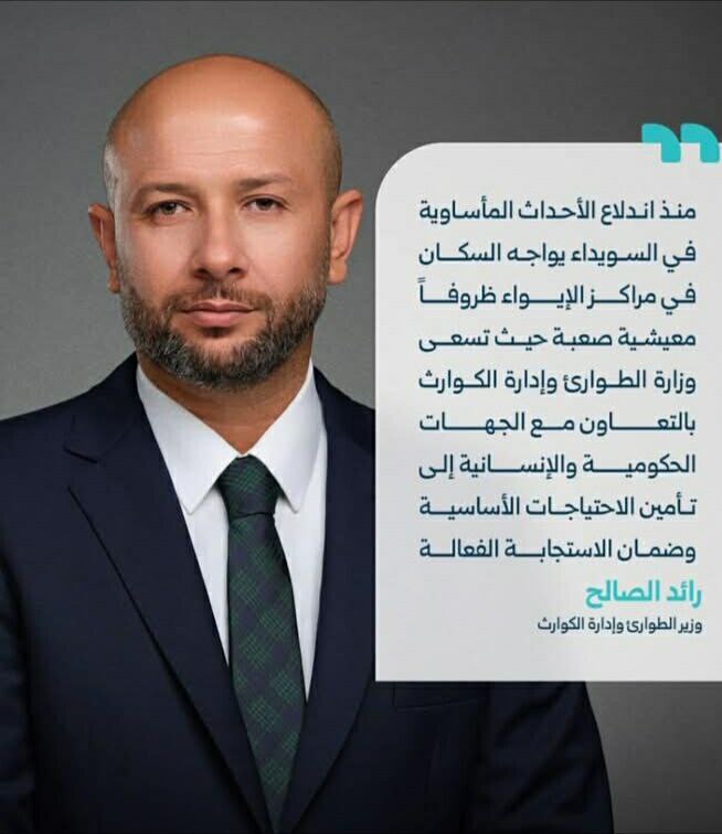 أكد وزير الطوارئ وإدارة الكوارث، رائد الصالح، عبر منصة X، أن الوزارة تواصل جهودها المكثفة منذ اندلاع الأحداث المؤسفة في محافظة السويداء، وذلك من خلال غرفة عمليات مشتركة تضم محافظتي السويداء ودرعا، وعدداً من الوزارات والمؤسسات الحكومية والمنظمات الإنسانية المعنية.