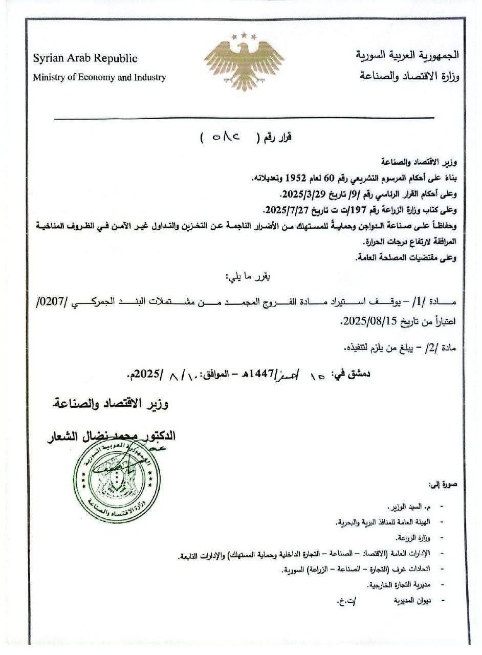 أعلنت وزارة الاقتصاد والصناعة اليوم عن وقف استيراد مادة الفروج المجمد المدرجة ضمن البند الجمركي رقم /0207/، اعتباراً من الخامس عشر من آب الجاري.