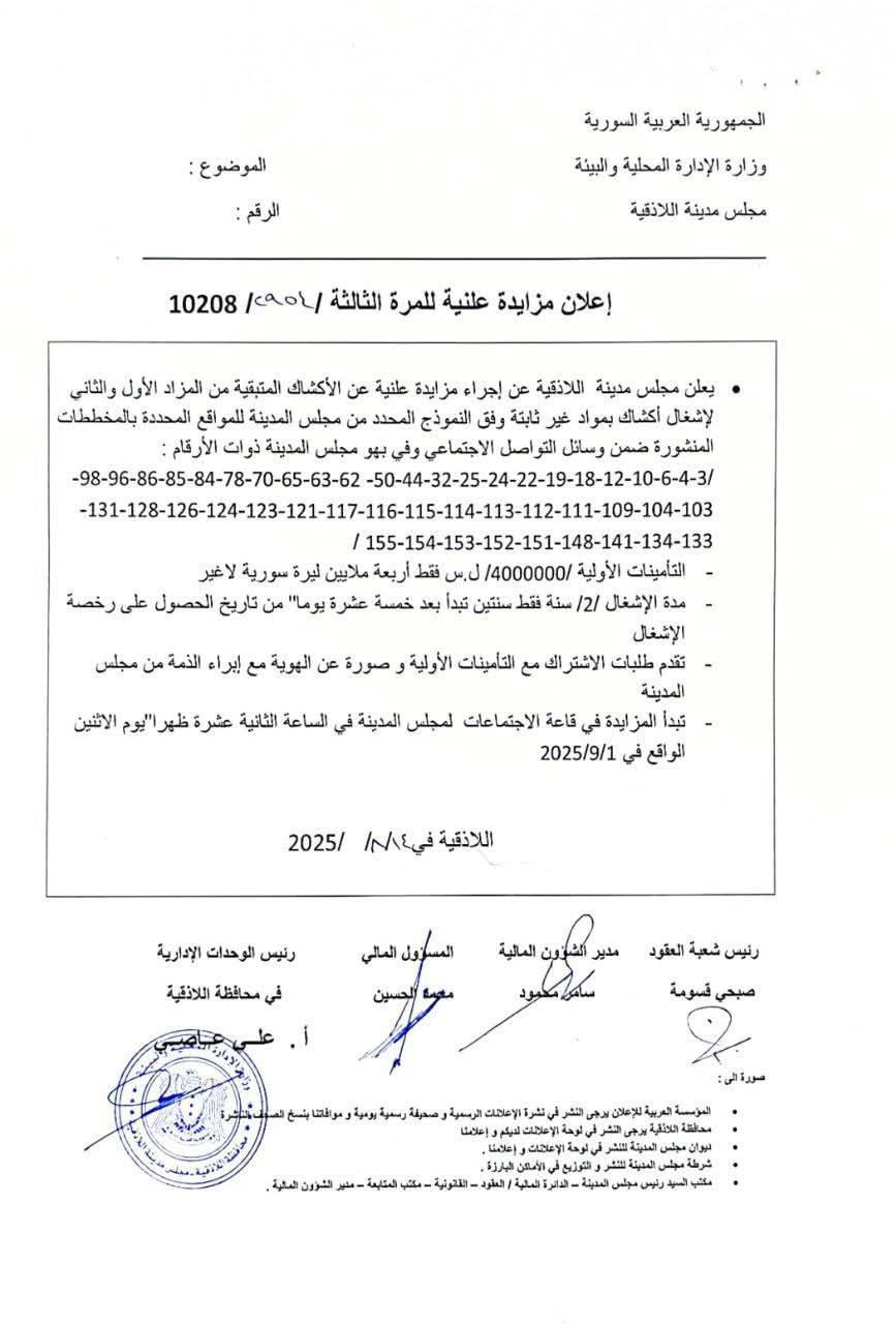 أعلن مجلس مدينة اللاذقية عن إجراء مزايدة علنية لإشغال أكشاك بمواد غير ثابتة، ووفق النموذج المعتمد، وذلك في مواقع مختارة ضمن المخططات المنشورة على وسائل التواصل الاجتماعي وفي بهو مجلس المدينة برقم محدد لكل كشك.