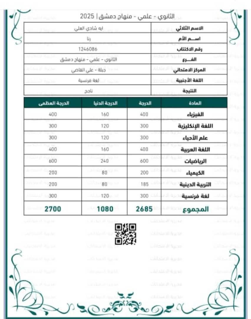 وتجسيداً عملياً لهذه القيم، جاء تفوق الطالبة آية شادي العلي من محافظة اللاذقية، الحاصلة على مجموع 2685 من أصل 2700 في الفرع العلمي للشهادة الثانوية العامة، وذلك رغم خسارتها علامة ونصف فقط في مادة الديانة.