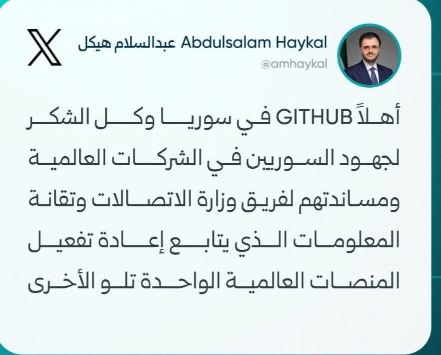أعرب وزير الاتصالات وتقانة المعلومات عبد السلام هيكل عن ترحيبه بإطلاق منصة GitHub في سوريا، معرباً عن سعادته بهذه الخطوة التي تأتي تتويجاً للجهود الكبيرة التي يبذلها السوريون العاملون في الشركات العالمية.