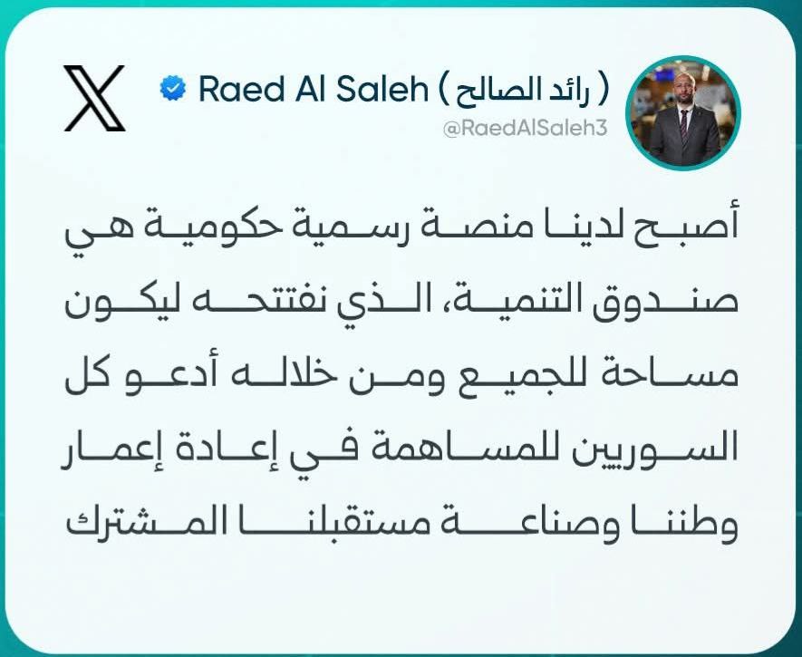 في إطار تعزيز جهود إعادة الإعمار، أعلن الصالح عن إطلاق “صندوق التنمية”، وهو منصة حكومية رسمية تهدف إلى جمع التبرعات والمساهمات من جميع السوريين. ودعا الجميع للمشاركة الفعالة في هذا الصندوق، قائلاً: “اليوم، نفتح أمامكم هذه المساحة لنساهم معاً في إعادة إعمار وطننا وبناء مستقبل مشترك”.