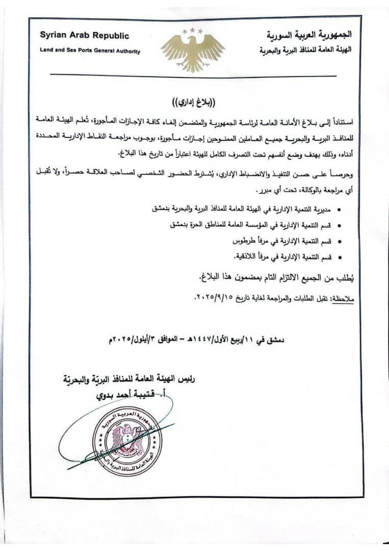 أصدرت الهيئة العامة للمنافذ البرية والبحرية بلاغاً إدارياً يُطلب فيه من جميع العاملين الحاصلين على إجازات مأجورة، مراجعة الجهات الإدارية المحددة أدناه، وذلك لوضع أنفسهم تحت تصرف الهيئة بشكل كامل، اعتباراً من تاريخ صدور هذا البلاغ.