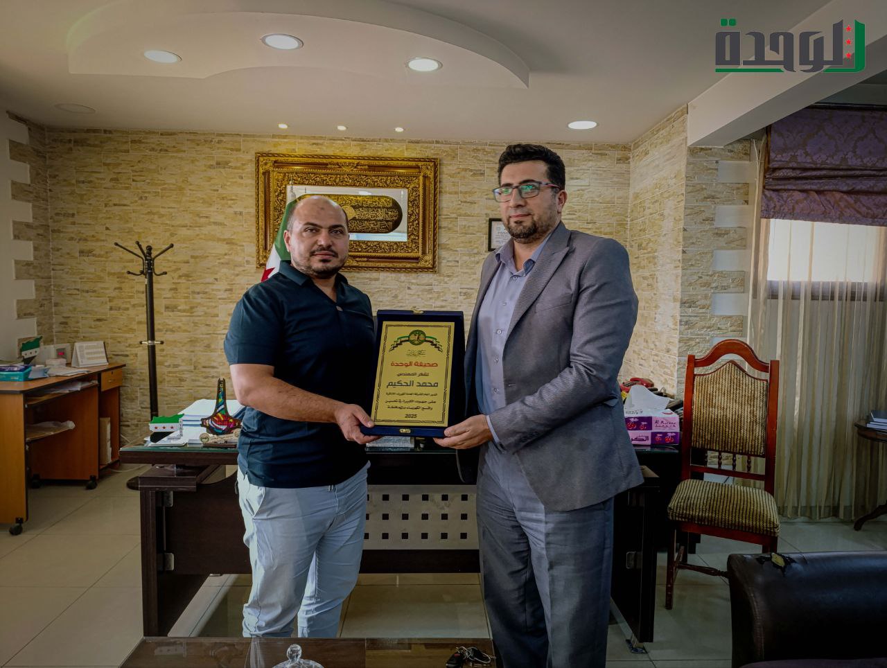 كرمت صحيفة الوحدة اليوم ، المهندس محمد الحكيم مدير عام شركة كهرباء اللاذقية بتقديم درع تكريمي باسم العاملين في الصحيفة قدمه الأستاذ محمود الرسلان رئيس التحرير وذلك تقديراً للجهود الكبيرة المبذولة في تحسين الواقع الكهربائي بالمحافظة ، مثنياً على جهود العاملين في شركة كهرباء اللاذقية وإدارتها لتفانيهم في العمل في ظل الظروف الحالية وضمن الإمكانات المتاحة .