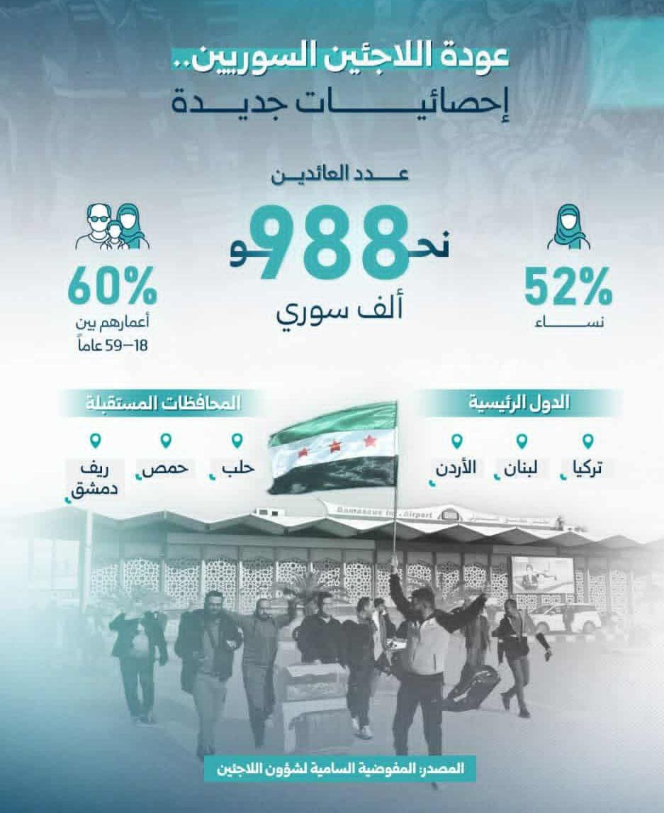 ويمثل هذا الرقم جزءاً من ملايين السوريين الذين هجّرهم النظام البائد نتيجة جرائم غير مسبوقة في تاريخ الإنسانية. كما تعكس هذه العودة تعلق السوري بوطنه، ورغبته الصادقة في المساهمة بإعادة إعمار البلاد، وتحريك عجلة الحياة في مختلف المجالات، بما يُعيد لسوريا دورها الإنساني والحضاري المعروف عبر العصور.