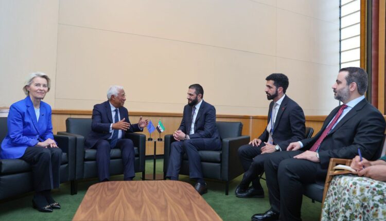 وشهد جدول أعمال الرئيس الشرع لقاءات منفصلة مع عدد من القادة الأوروبيين والعرب على هامش أعمال الدورة الثمانين للجمعية العامة للأمم المتحدة في نيويورك، جاءت بحضور وزير الخارجية والمغتربين أسعد الشيباني، وشملت رئيس المجلس الأوروبي أنطونيو كوستا، ورئيسة المفوضية الأوروبية أورسولا فون دير.