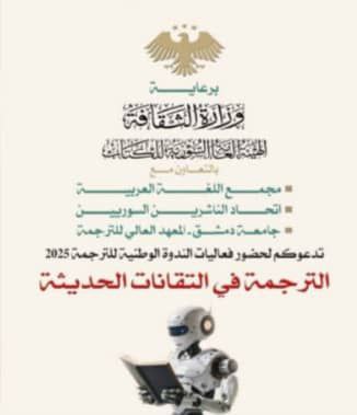 بمناسبة اليوم العالمي للترجمة تقيم الهيئة العامة السورية للكتاب في وزارة الثقافة الندوة الوطنية للترجمة 2025 بعنوان /الترجمة في التقانات الحديثة/ يومي الخامس والسادس من تشرين الأول في المكتبة الوطنية بدمشق.
