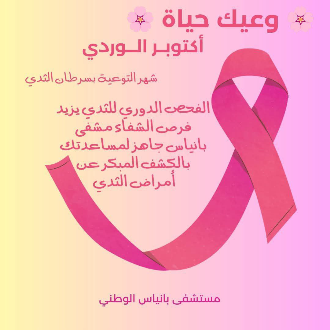 تنطلق اليوم فعاليات مستشفى بانياس الوطني ضمن الحملة الوطنية للتوعية بسرطان الثدي، حيث تبدأ حملة “وعيك حياة”، وذلك طيلة فترة الدوام الرسمي ابتداء من الساعة ٩ صباحاً.