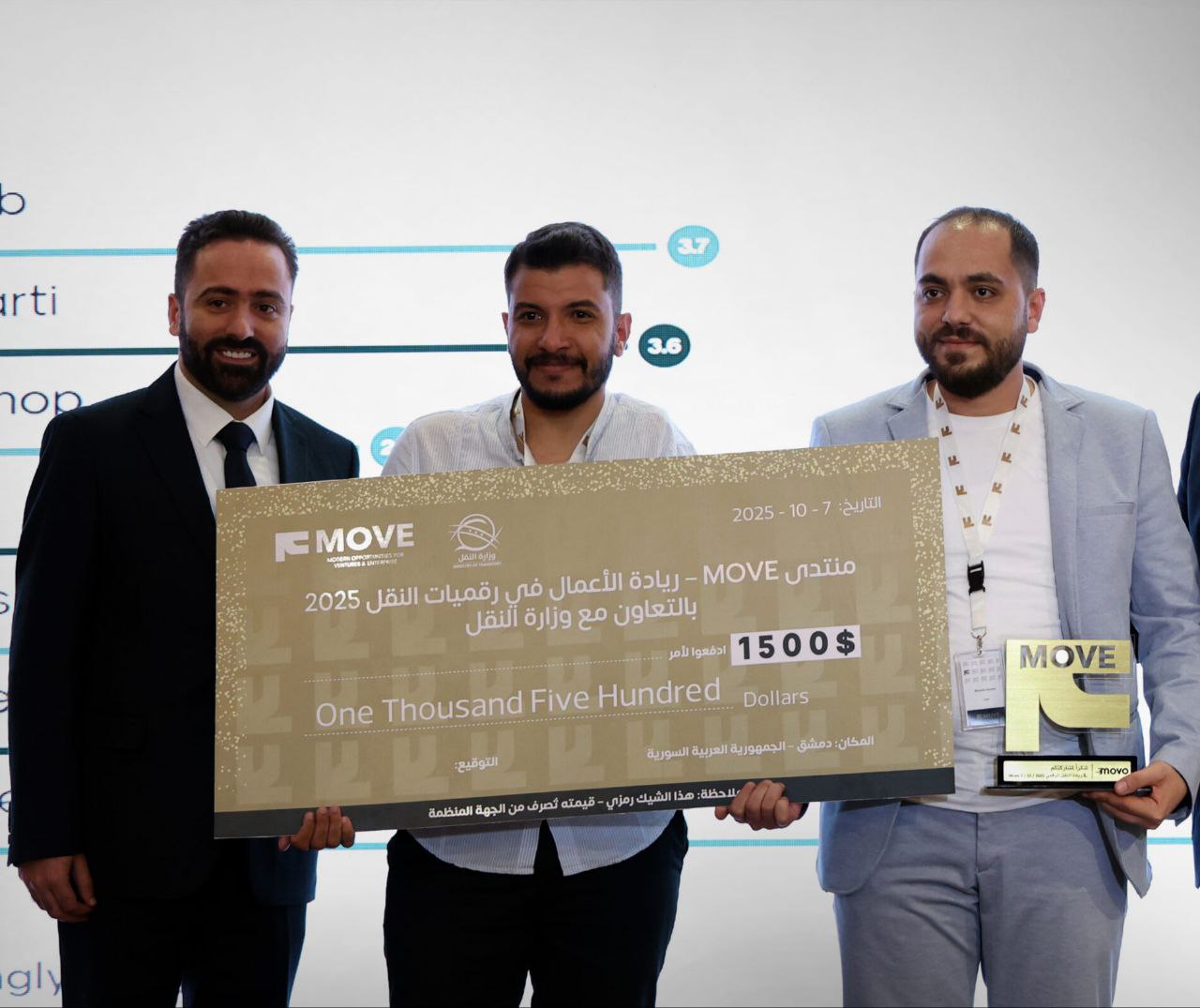 وكان منتدى ريادة الأعمال في رقميات النقل “MOVE” قد انطلق اليوم في دمشق بتنظيم من وزارة النقل بالتعاون مع منصة”YallaGo”، حيث تضمن عرض 132 مشروعاً ريادياً، منها سبعة مشاريع موزعة على مختلف قطاعات النقل، واختُتم بتكريم المشاريع الثلاثة الفائزة بجوائز مالية وشهادات تقدير تشجيعاً للابتكار في قطاع النقل الرقمي.