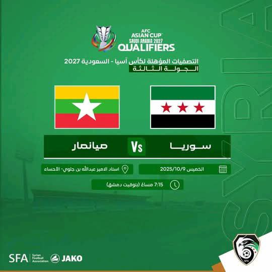 يلتقي اليوم منتخبنا الوطني للرجال بكرة القدم مع نظيره منتخب ميانمار في مباراة الذهاب بتمام الساعة السابعة والربع مساءً بتوقيت دمشق ضمن الجولة الثالثة من تصفيات كأس آسيا 2027 على استاد الأمير عبد الله بن جلوي في الإحساء بالمملكة العربية السعودية.