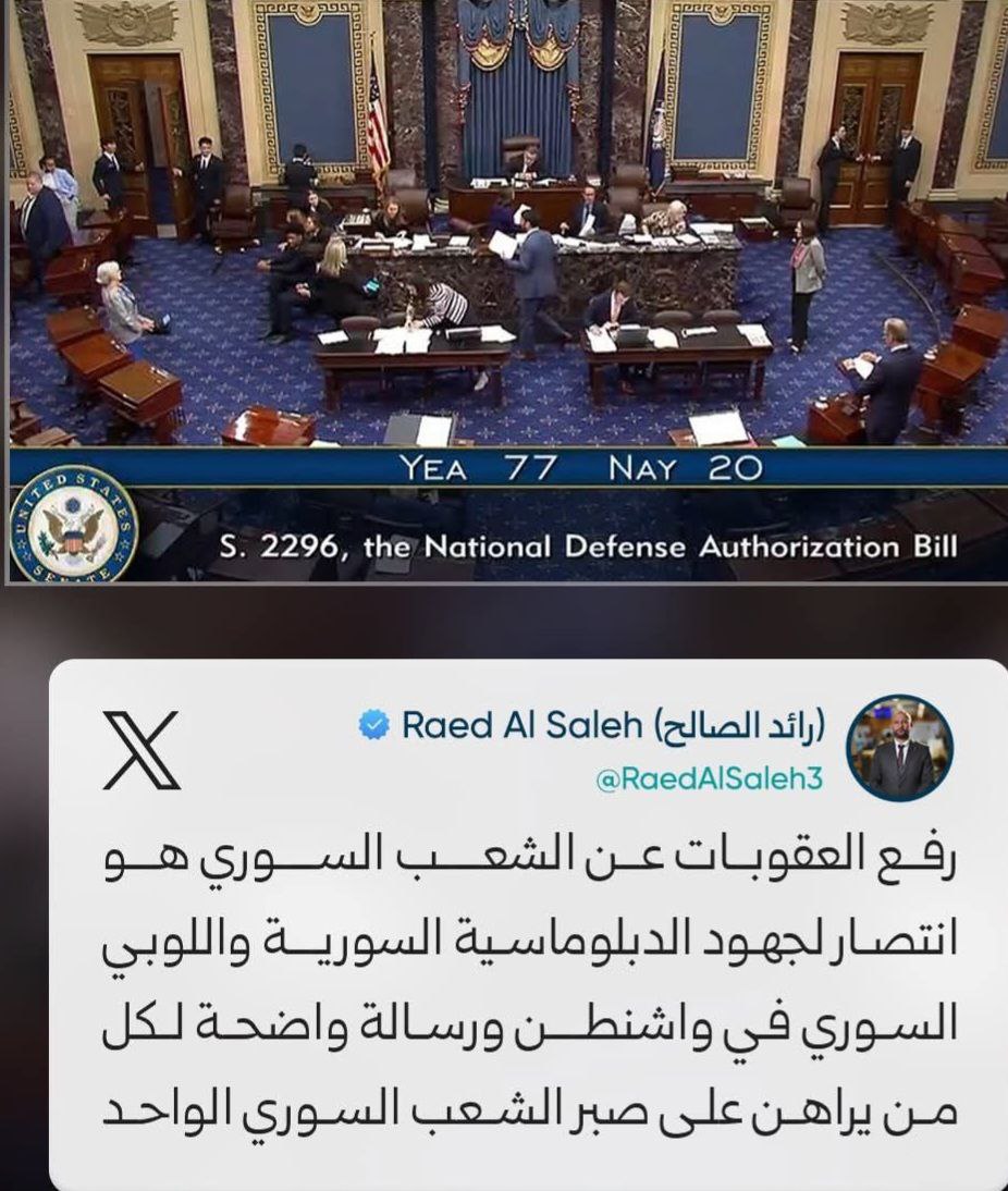 صرّح وزير الطوارئ وإدارة الكوارث رائد الصالح عبر منصة إكس (X) أن هذا اليوم يُعد حدثاً تاريخياً للسوريين، بعد أن أقرّ مجلس الشيوخ الأمريكي إلغاء قانون قيصر ضمن مشروع قانون الدفاع الوطني الأمريكي.