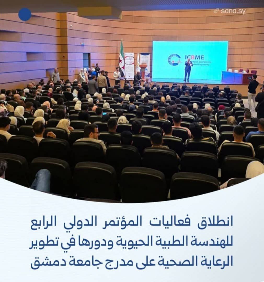 انطلقت على مدرج جامعة دمشق فعاليات المؤتمر الدولي الرابع للهندسة الطبية الحيوية ودورها في تطوير الرعاية الصحية، الذي تقيمه كلية الهندسة الميكانيكية والكهربائية في جامعة دمشق بالتعاون مع كلية الهندسة الطبية في جامعة الأندلس الخاصة للعلوم الطبية.