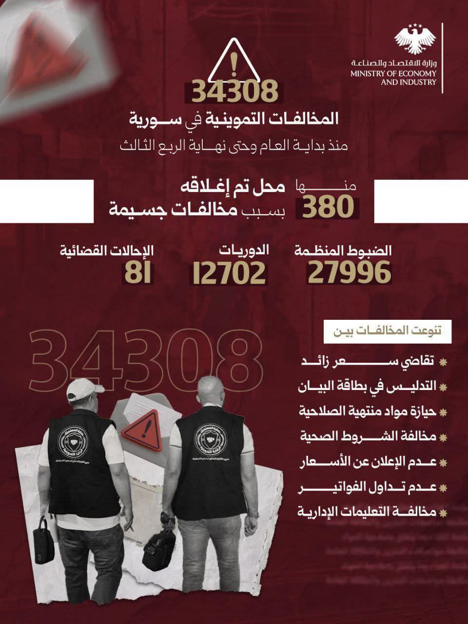 كشفت الإدارة العامة للتجارة الداخلية وحماية المستهلك عن حصيلة حملاتها الرقابية المكثفة على الأسواق السورية خلال الأشهر التسعة الأولى من العام الجاري، حيث تم تسجيل 34308 مخالفة تموينية، وأسفرت هذه المخالفات عن إغلاق 380 منشأة تجارية بشكل مؤقت، إثر ارتكاب تجاوزات جسيمة.