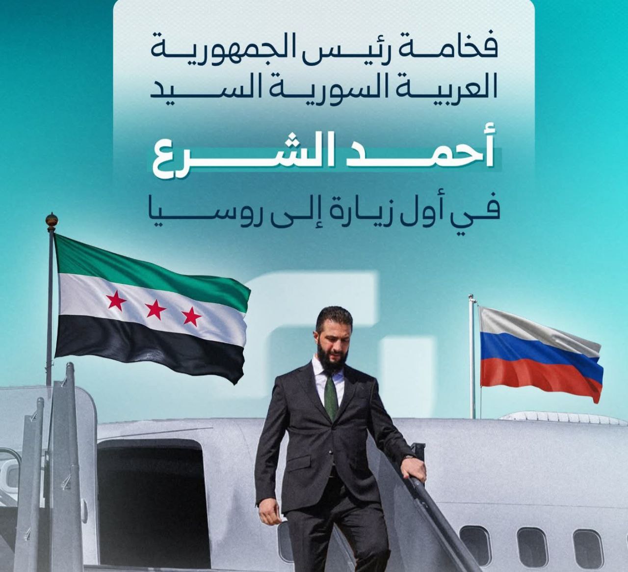 وصل السيد الرئيس أحمد الشرع اليوم إلى روسيا الاتحادية في زيارة رسمية يجري خلالها مباحثات مع الرئيس الروسي فلاديمير بوتين تتناول سبل تعزيز العلاقات الثنائية بين البلدين، إلى جانب بحث آخر المستجدات الإقليمية والدولية.