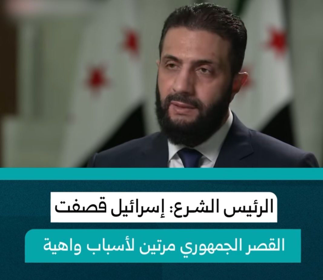 في مقابلة حصرية مع شبكة CBS الأمريكية، أدلى السيد الرئيس أحمد الشرع بتصريحات حول الاعتداءات الإسرائيلية المتكررة على الأراضي السورية، مؤكداً أن إسرائيل قصفت القصر الجمهوري السوري مرتين بذريعة ما وصفها بـ«أسباب واهية»، معتبراً أن هذه الاستفزازات تهدف إلى جرّ سوريا إلى حالة من الصراع والحرب.