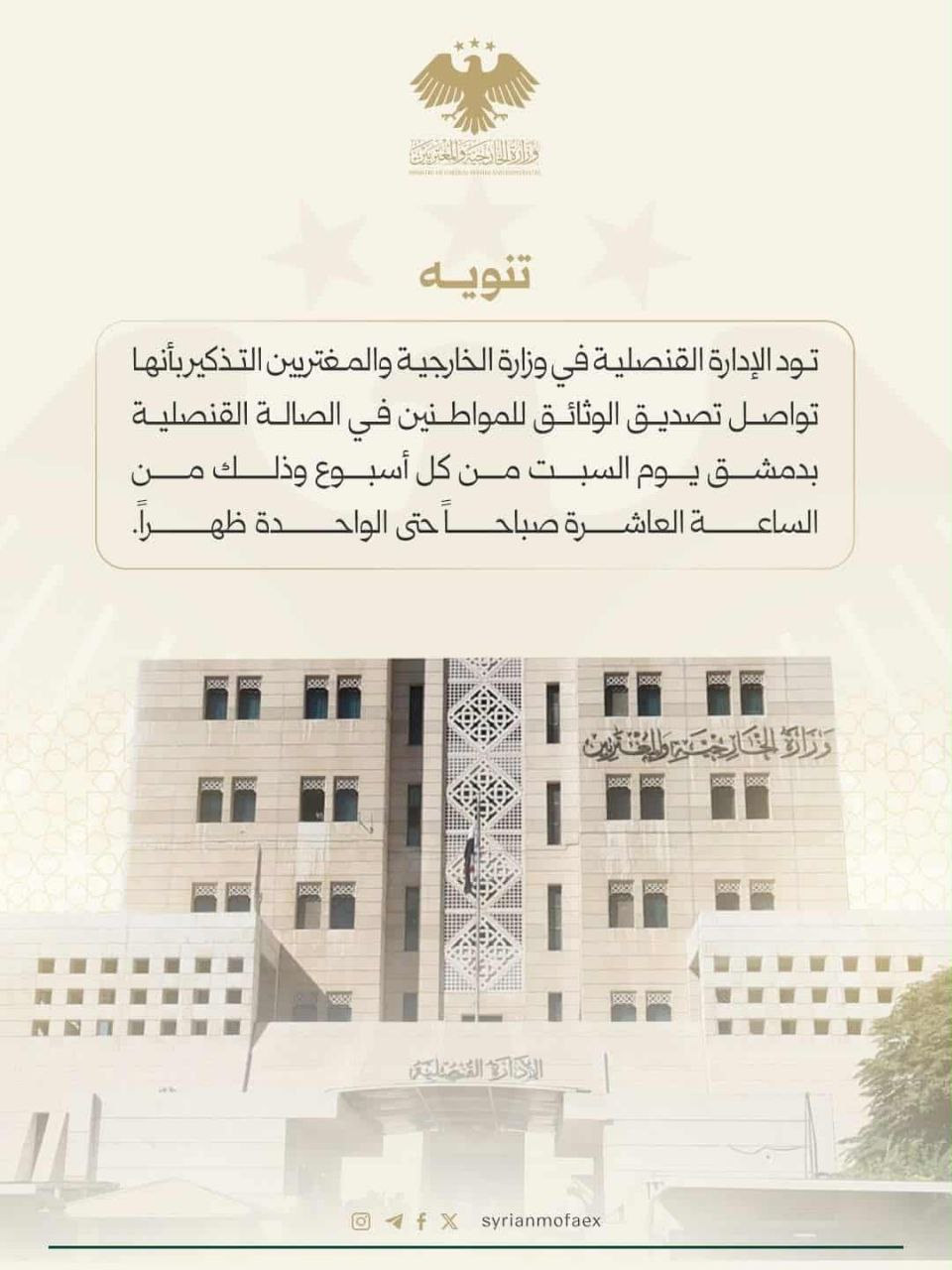 ذكّرت الإدارة القنصلية في وزارة الخارجية والمغتربين بأنها تواصل استقبال المواطنين من أجل تصديق الوثائق الرسمية في الصالة القنصلية بدمشق يوم السبت من كل أسبوع، وذلك من الساعة العاشرة صباحاً حتى الواحدة ظهراً، بهدف تسهيل الإجراءات وتخفيف الضغط عن بقية أيام الأسبوع.