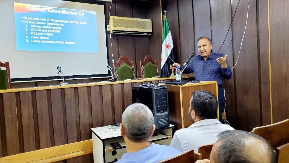 استقبل المشفى الوطني بطرطوس الدكتور سهيل زافارو استشاري أمراض قلب في أمريكا – كاليفورنيا، والذي قدم محاضرة علمية بعنوان: “تدبير أمراض الشرايين الإكليلية المزمنة، المعالجة الدوائية بالمقارنة مع إعادة التروية: توسيع أو جراحة”.