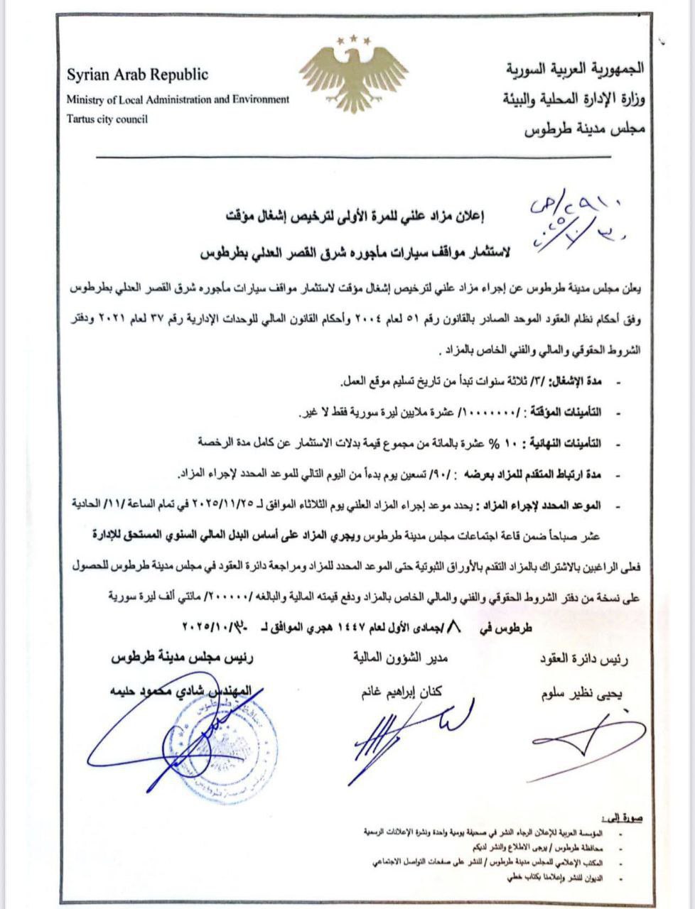 أعلن مجلس مدينة طرطوس عن إجراء مزاد علني لترخيص إشغال مؤقت، يهدف إلى استثمار مواقف سيارات مأجورة تقع شرق القصر العدلي في طرطوس.