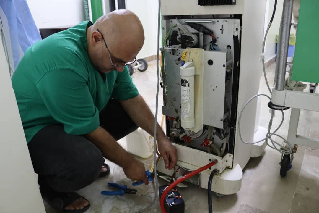وبفضل كفاءة الكادر الفني وقدرته على التعامل مع أدق تفاصيل التجهيزات الطبية تم تجميع البطاريات، والفحص، والتركيب، والتجريب بشكل كامل داخل المستشفى، كما تم إعادة جهاز غسيل كلية إلى العمل بعد إصلاحه، حيث تم استبدال المضخة القديمة العاطلة عن العمل بمضخة سحب أملاح جديدة من قبل المهندس بشر ديب.