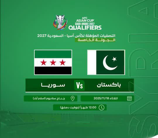 يلتقي اليوم منتخبنا الوطني للرجال بكرة القدم مع نظيره منتخب الباكستان على ملعب “جِناح” في العاصمة الباكستانية إسلام آباد في تمام الساعة الثانية عشرة ظهراً بتوقيت دمشق، وذلك في لقاء الإياب ضمن مباريات الجولة الخامسة من تصفيات كأس آسيا2027.
