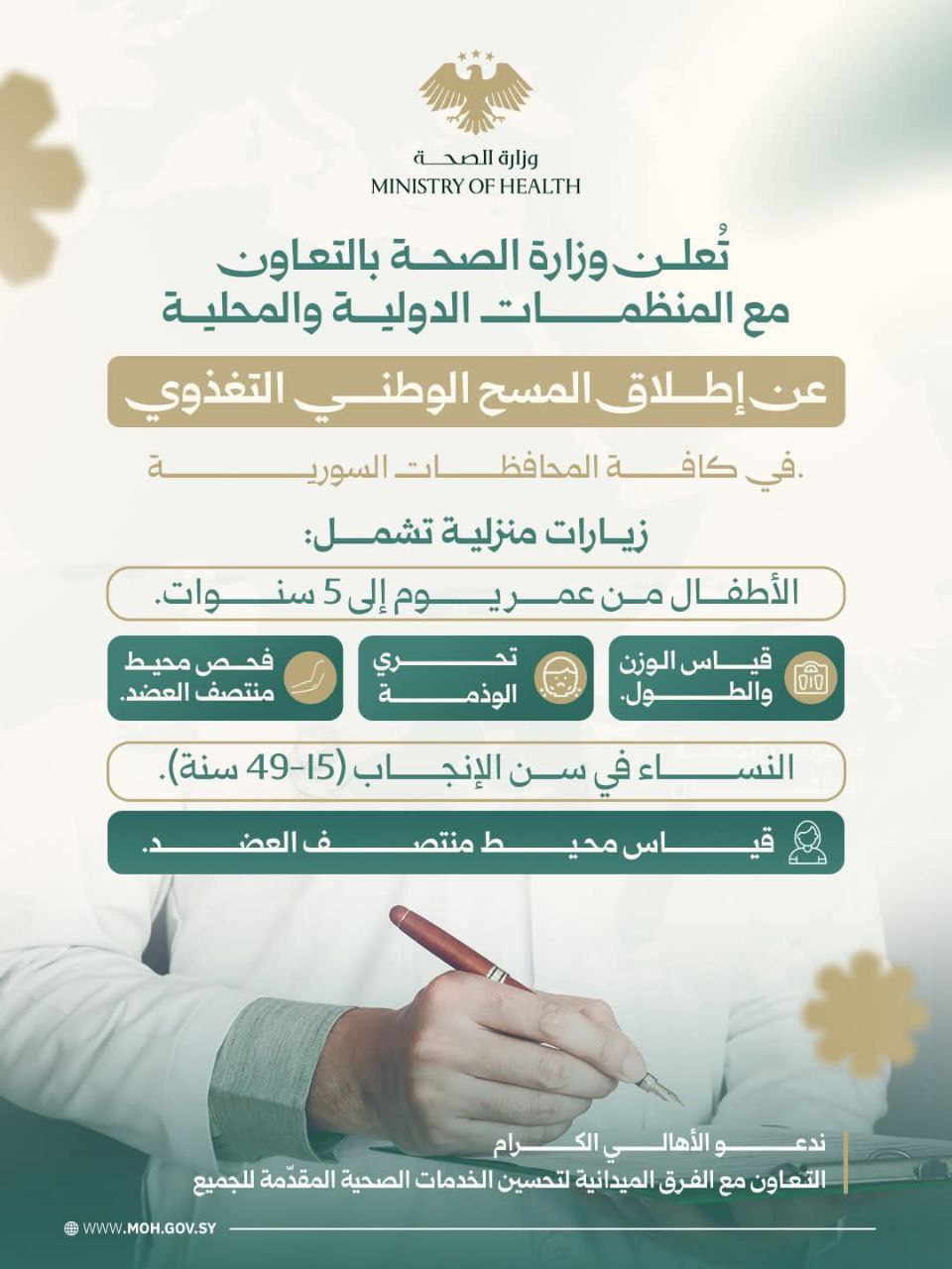 أعلنت وزارة الصحة عبر برنامج التغذية الوطني عن إطلاق مسح وطني شامل يستهدف الأطفال دون سن الخامسة والنساء في سن الإنجاب، بهدف تقييم الحالة التغذوية وتحديث البيانات اللازمة لوضع استراتيجية وطنية متعددة القطاعات.