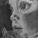 إحدى أبرز أعمالها التي تستحق الوقوف عندها هي رسمها لطفل يبكي مع قطة، في هذه اللوحة يلتقي الحزن بالبراءة، ويتجسد الصراع الداخلي الذي قد يعيشه الإنسان في لحظات الألم، القطة كما يراها البعض ليست مجرد حيوان أليف بل هي رمز للأمان والراحة التي يبحث عنها الإنسان في أوقات ضعفه، يظهر الطفل في اللوحة ببعض التفاصيل الدقيقة التي تعكس تعبيراًعاطفياً قوياً، حيث تقترب عيناه من أن تبوح بمشاعر أكثر من مجرد الحزن، بينما تداعب القطة جسده بلطف مما يوحي بقوة العلاقة بين الإنسان والحيوان.