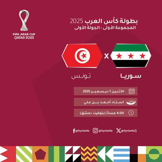 على استاد أحمد بن علي عند الساعة الرابعة عصراً بتوقيت دمشق، وذلك ضمن الجولة الأولى من دور المجموعات ولحساب المجموعة الأولى من بطولة كأس العرب بكرة القدم بنسختها الحادية عشرة، و تُعد هذه البطولة الأغلى من حيث القيمة المالية في تاريخ البطولة والتي ستنطلق اليوم في قطر بمشاركة 16 منتخبناً عربياً تم توزيعهم على أربعة مجموعات حيث ضمت المجموعة الأولى منتخبات قطر (المستضيف)، فلسطين، سوريا، تونس، فيما ضمت المجموعة الثانية منتخبات السعودية، المغرب، جزر القمر، عُمان، و المجموعة الثالثة ضمت منتخبات مصر، الأردن، الكويت، الإمارات، و المجموعة الرابعة ضمت منتخبات الجزائر (حامل اللقب)، العراق، البحرين، السودان.