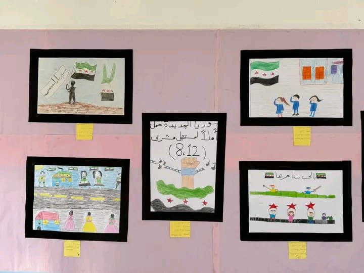 وضم المعرض لوحات تحمل عبارات وصوراً توثق ذاكرة الثورة، ورسومات عبرت عن انتصار الثورة السورية ومرور أربعة عشر عاماً من الصمود والنضال، مؤكدة حتمية النصر. كما حضر علم الجمهورية العربية السورية بقوة في معظم الأعمال تعبيراً عن الانتماء والهوية الوطنية.