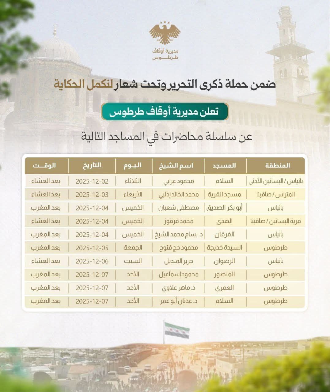 أعلنت دائرة شؤون المساجد في مديرية أوقاف طرطوس عن انطلاق سلسلة من المحاضرات في مختلف مساجد المحافظة، ضمن خطة موحدة لإحياء معاني النصر وتعزيز القيم الوطنية والإيمانية، وذلك في إطار حملة “عيد التحرير” تحت شعار “لنكمل الحكاية”.