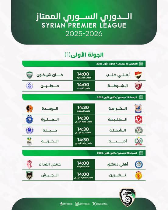 تفتتح يوم غد الخميس منافسات الدوري السوري الممتاز بكرة القدم لموسم 2025 – 2026 بمشاركة 16 نادياً، حيث تقام منافسات الجولة الأولى عبر لقاءين، اللقاء الأول يجمع أهلي حلب حامل اللقب في الموسم الماضي مع خان شيخون الصاعد حديثاً للدوري الممتاز والقادم من إدلب، والمباراة ستقام على أرض ملعب الحمدانية بحلب، وفي اللقاء الثاني والذي سيقام على ملعب الفيحاء بدمشق يستضيف الشرطة ضيفه حطين القادم من اللاذقية والمباراتان ستبدأن عند الساعة الثانية ظهراً.