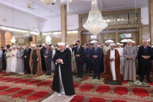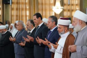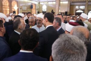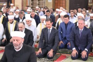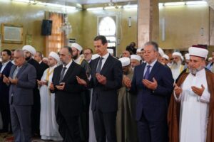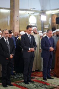 شارك السيد الرئيس بشار الأسد بالاحتفال الديني الذي أقامته وزارة الأوقاف اليوم إحياءً لذكرى مولد الرسول الكريم محمد صلى الله عليه وسلم في رحاب جامع عمر بن الخطاب في مدينة اللاذقية حيث أدى صلاة الظهر مؤتماً بفضيلة الشيخ الدكتور محمود حكيم.