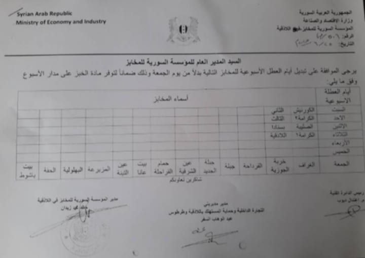 وأعلنت المخابز عن إدراج جدول أيام عطلتها وفق الجدول أدناه.