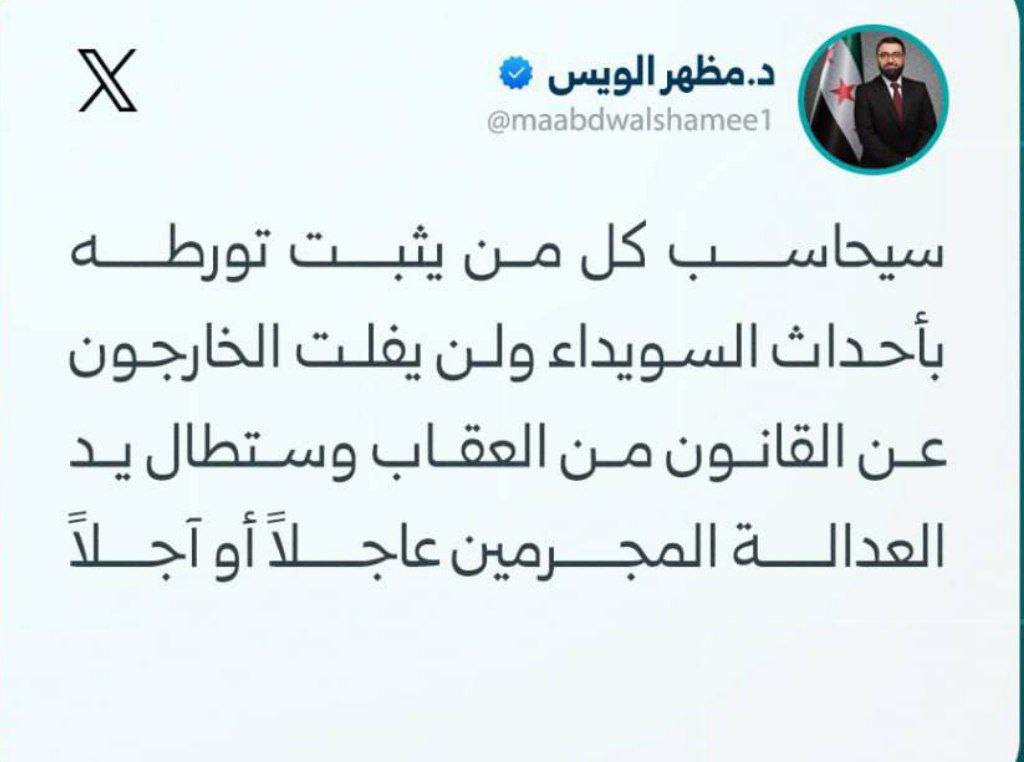 وأشار السيد وزير العدل في تغريدته إلى أنه بعد إجراءات مستنفرة وعاجلة توصلت الدولة إلى وقف لإطلاق النار بالسويداء، وتهدئة في المناطق لإنقاذ المحتجزين الأبرياء، وتأمين خروجهم وبدء دخول المساعدات الإنسانية، تمهيداً لعودة مؤسسات الدولة وترسيخ الأمن وحماية جميع المواطنين، وسرعان ما أخذت تتكشف الأهوال والمآسي التي خلفتها تلك الأحداث.