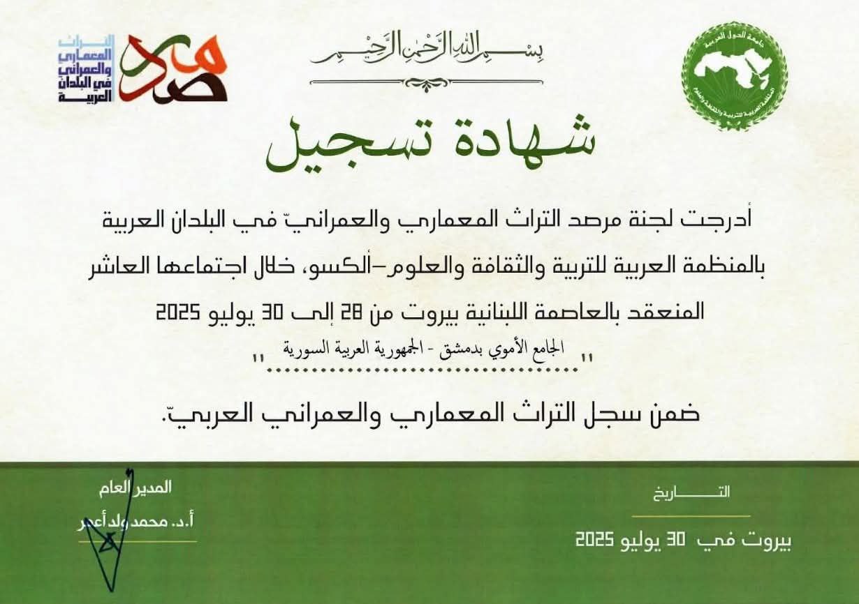 في إنجازٍ ثقافي جديد يُعزّز مكانة التراث السوري العريق، أدرجت لجنة مرصد التراث المعماري والعمراني في البلدان العربية التابعة للمنظمة العربية للتربية والثقافة والعلوم “ألكسو”، الجامع الأموي بدمشق ضمن سجل التراث المعماري والعمراني العربي، وذلك خلال اجتماعها العاشر الذي انعقد في بيروت خلال الفترة من 28 إلى 30 من تموز الفائت، حيث أصبح الجامع الأموي أوّل موقع سوري إسلامي يُدرج على هذه القائمة ضمن الدفعة الأولى من المواقع المسجلة من مختلف البلدان العربية، والتي بلغ عددها 19موقعاً، وذلك بعد أن مُنحت سوريا شهادة التسجيل.