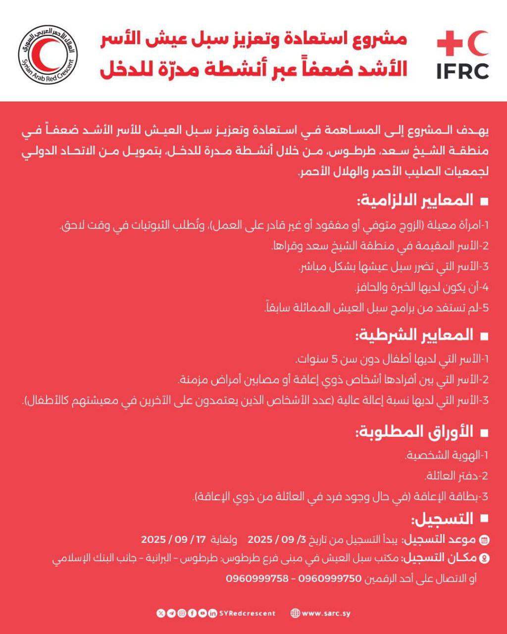 يُذكر أن التسجيل بدأ من تاريخ 3 أيلول ويستمر لغاية 17 أيلول في مكتب سبل العيش في مبنى فرع طرطوس في حي البرانية، بجانب البنك الإسلامي.