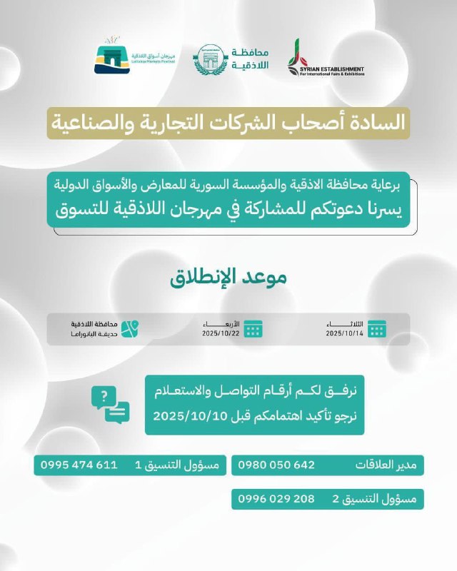 ودعت اللجنة المنظمة جميع أصحاب الشركات التجارية والصناعية الراغبين بالمشاركة إلى تأكيد اهتمامهم قبل تاريخ 10 تشرين الأول 2025، لتسهيل إجراءات التنظيم وضمان نجاح المهرجان.