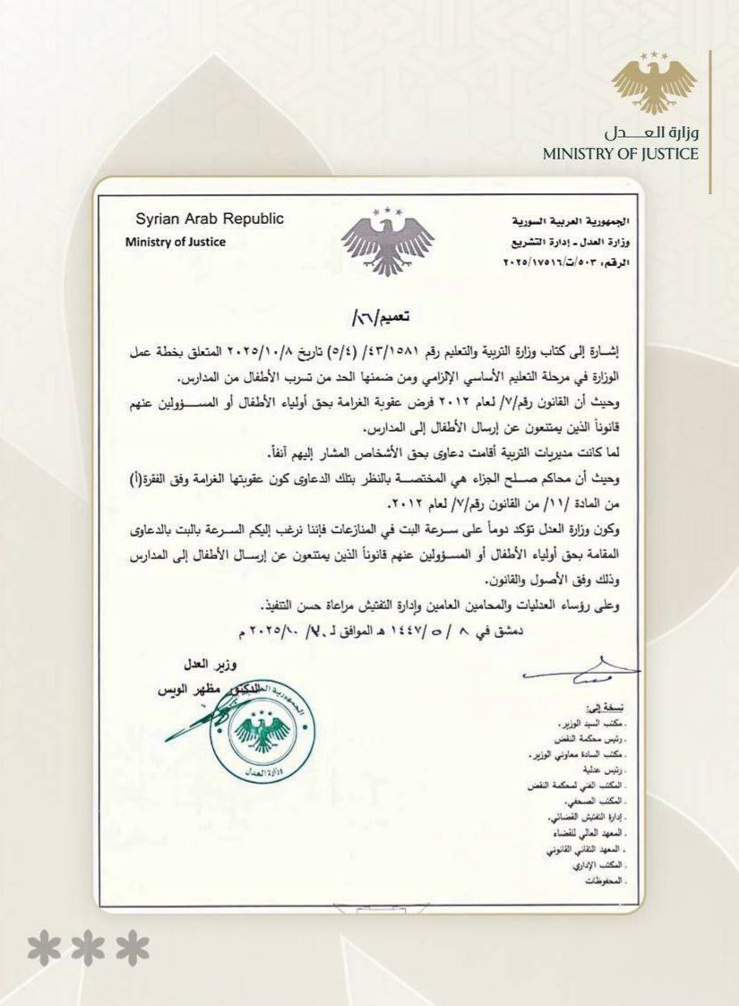 أصدرت وزارة العدل تعميماً تؤكد فيه على أهمية التطبيق السريع والفعال للإجراءات القانونية في الدعاوى المقامة بحق أولياء الأمور أو المسؤولين قانوناً عن الأطفال الذين يمتنعون عن إرسالهم إلى المدارس وفقاً للأصول القانونية، مع التأكيد على فرض عقوبة الغرامة بحق أولياء الأطفال، وذلك استناداً إلى القانون رقم 7 لعام 2012.