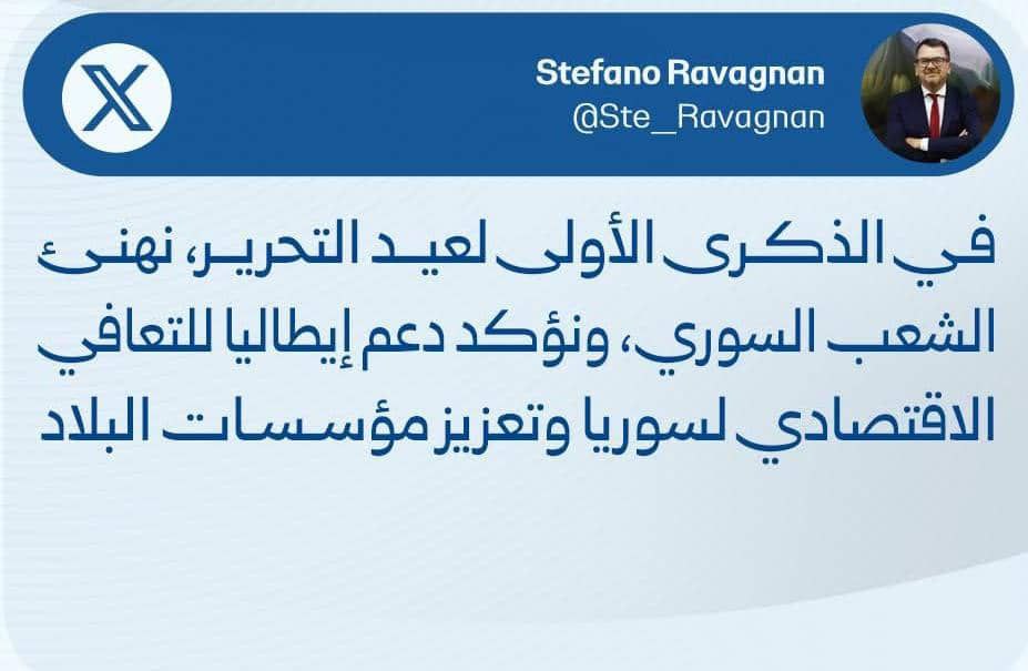 قدّم سفير إيطاليا في سوريا ستيفانو رافانيان تهنئته للشعب السوري بمناسبة الذكرى الأولى لعيد التحرير، وذلك عبر منشور نشره على منصة “X”. وأكد رافانيان في رسالته دعم بلاده لجهود التعافي الاقتصادي في سوريا، مشدداً على أهمية تعزيز مؤسسات الدولة من خلال المشاركة الفعالة لكافة مكونات المجتمع السوري.