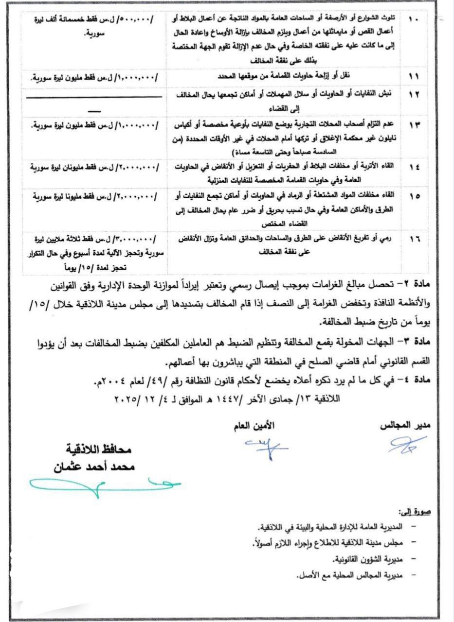 وبناءً على كتاب المدير العام للإدارة المحلية والبيئة رقم 166/ص تاريخ 4/12/2025، وعلى ما تقرر في اجتماع مجلس المحافظة بالجلسة الاستثنائية رقم 1 المنعقدة بتاريخ 4/12/2025، تم تصديق قرار رئيس مجلس مدينة اللاذقية رقم 55 تاريخ 4/12/2025 المتضمن الموافقة على تعديل الغرامات الخاصة بمخالفات قانون النظافة رقم 49 لعام 2004.