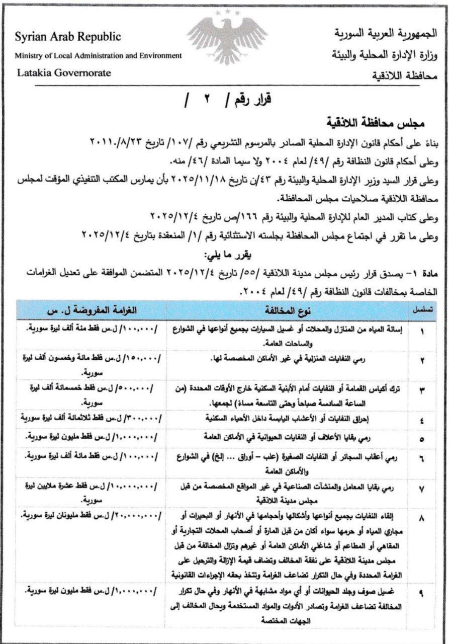 أصدر مجلس محافظة اللاذقية القرار رقم 2 الخاص بتعديل غرامات النظافة في المدينة، بناءً على قانون الإدارة المحلية رقم 107 تاريخ 23/8/2011، وعلى قانون النظافة رقم 49 لعام 2004، وعلى قرار وزير الإدارة المحلية والبيئة رقم 43 تاريخ 18/11/2025.