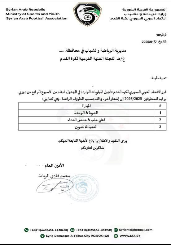 قرر اتحاد كرة القدم تأجيل عدة مباريات من مباريات الجولة الرابعة من دوري برايم للمحترفين بكرة القدم، حيث أصدر أمس بلاغاً يقضي بتأجيل مباريات الحرية مع الوحدة و أهلي حلب مع حمص الفداء و الفتوة مع تشرين وذلك بسبب الأوضاع الراهنة في مدينة حلب.
